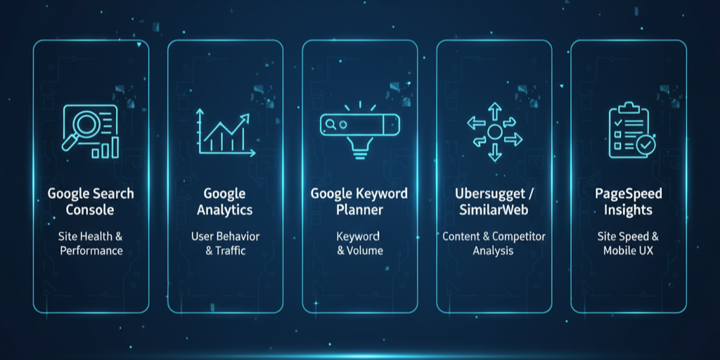 SEO対策を効率的に進めるには、適切なツールの活用が不可欠です。ここでは、初心者でも使いやすい無料(または無料プランがある)ツールを5つご紹介します。